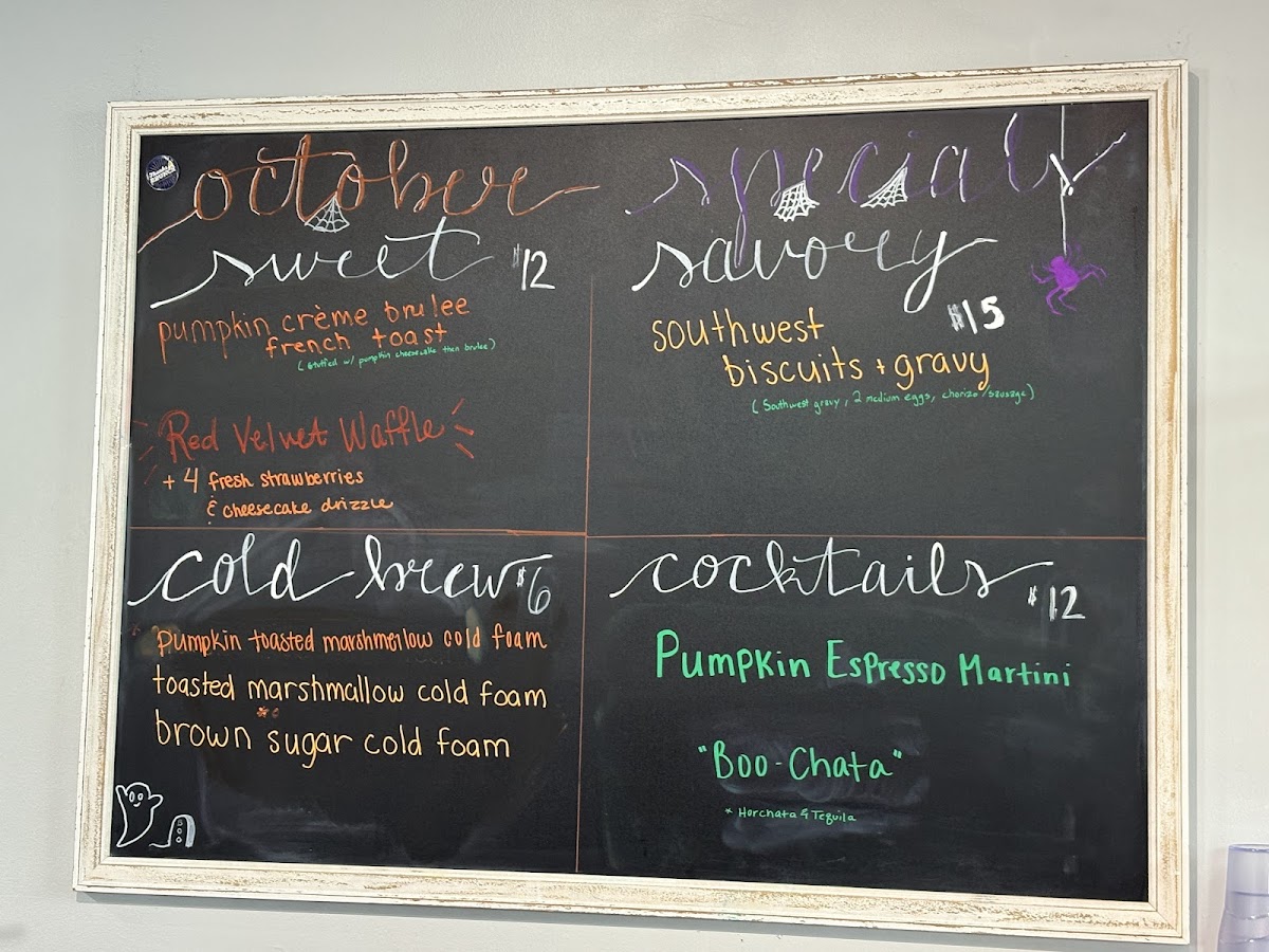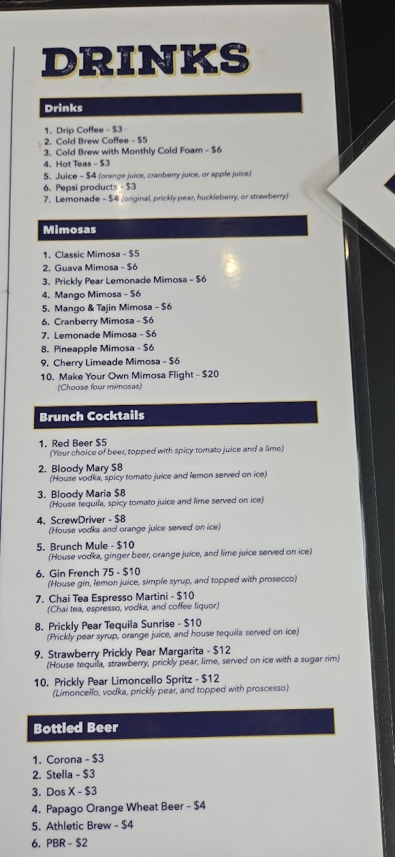 This menu is appropriate for breakfast and brunch occasions, offering options for quick orders or more casual sit-down meals. The variety of savory and sweet items, along with the beverage choices, provide diverse possibilities for guests seeking traditional and creative morning dining experiences.
